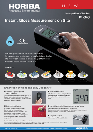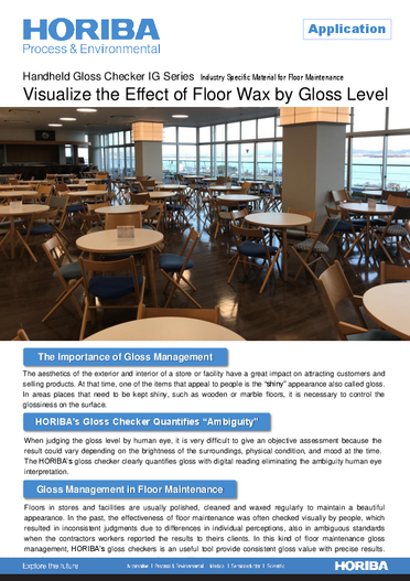 The appearance, interior, and beauty of a store or facility affect the number of customers drawn in and products sales; therefore, these exert a great impact on the store or facility. Usually, floors are cleaned or waxed regularly to maintain their beauty. Conventionally, the effects of such cleaning work are checked in a visual inspection performed by inspectors, but due to differences in judgment among individual inspectors, the criteria for the effects are naturally vague. In such gloss management during floor maintenance, HORIBA's gloss checker is a helpful tool for converting such vagueness into numerical values.
